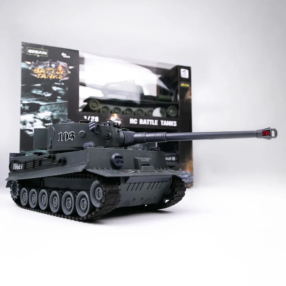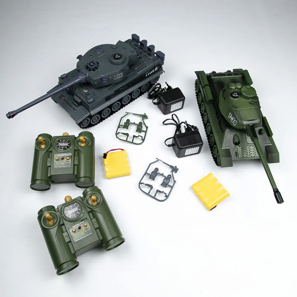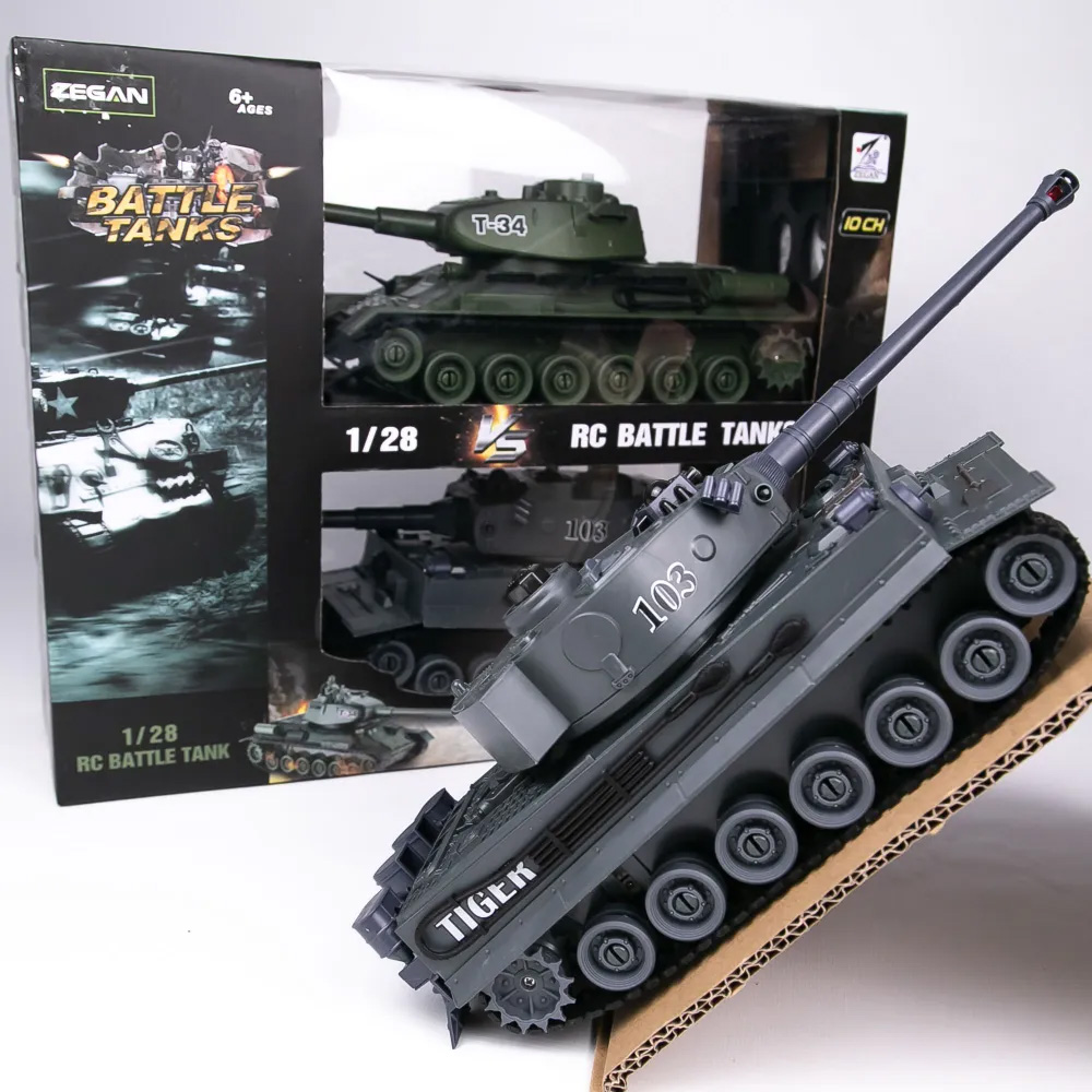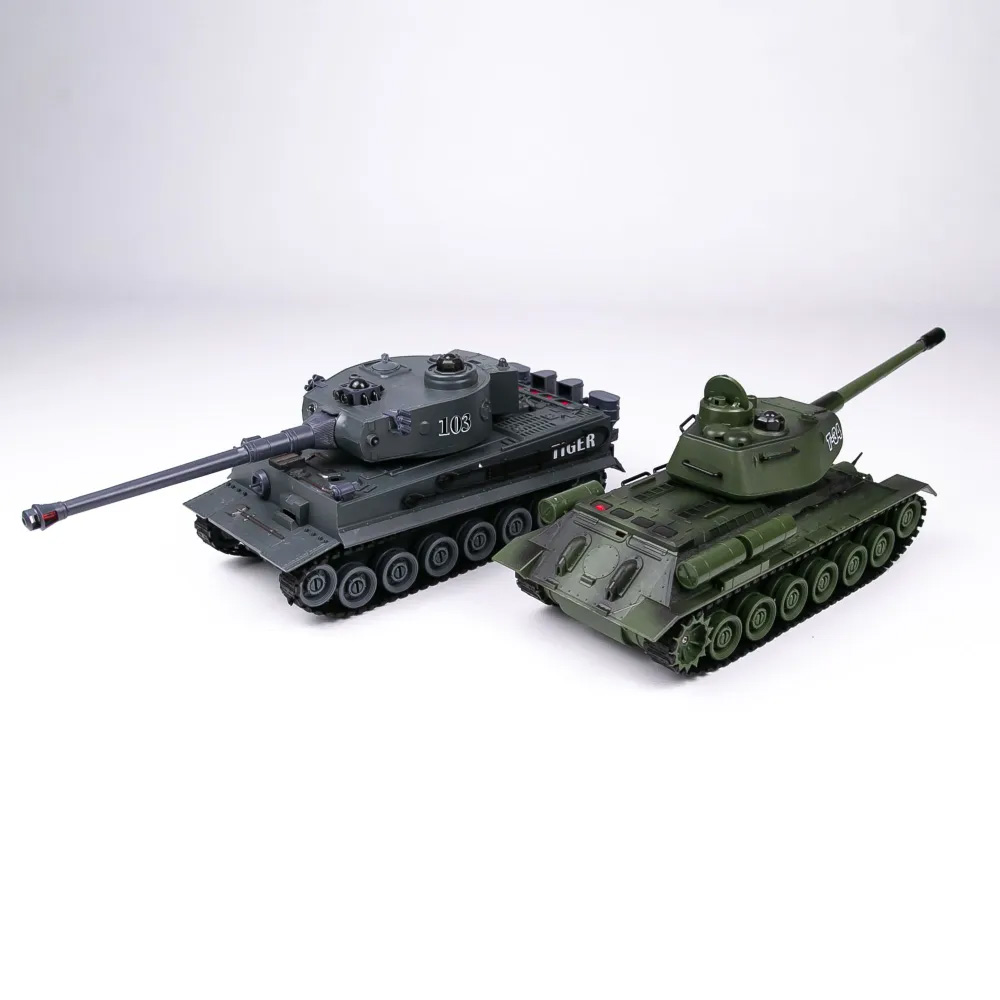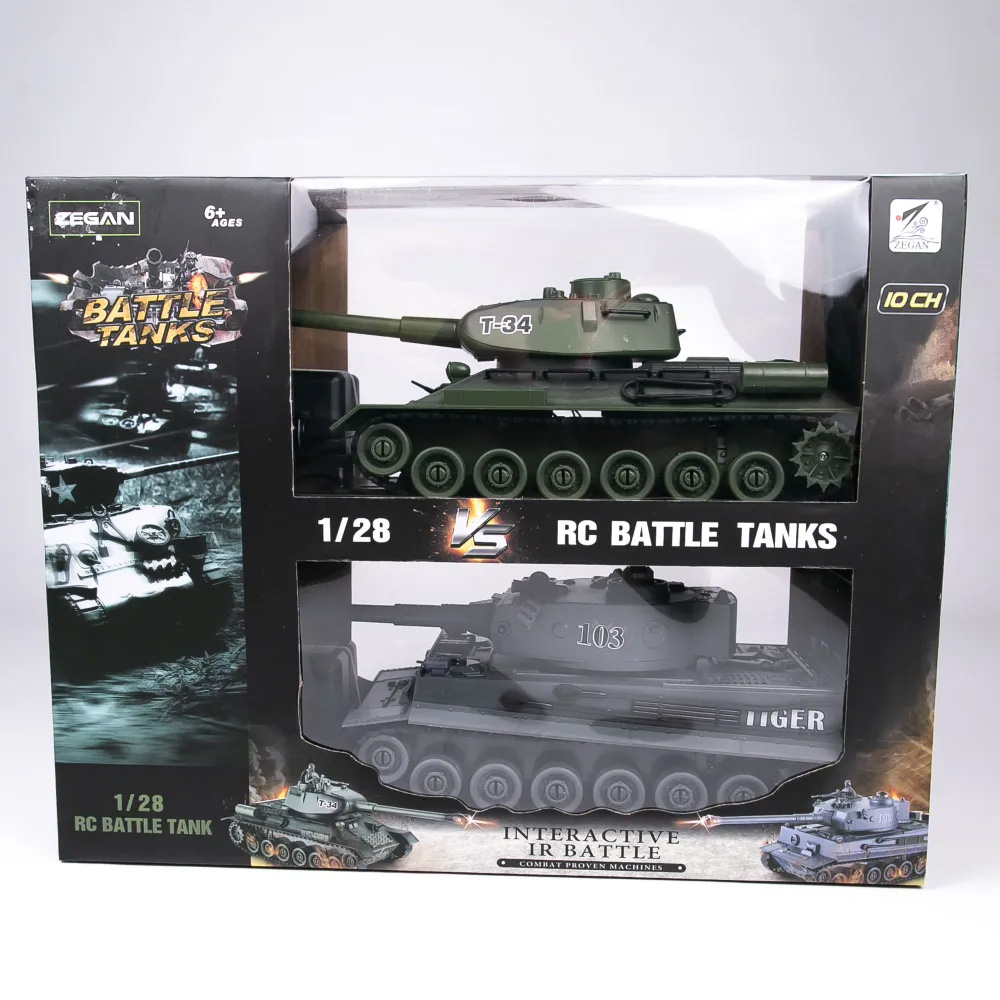 Радиоуправляемый танковый бой T34 и Tiger 1:28 - ZEG-99824 - это набор из двух радиоуправляемых моделей танков, которые работают на частоте 2.4G. Стрельба осуществляется инфракрасным лучом на расстояние до 3 м в секторе до 10 градусов. На задней части башни расположены 5 светодиодов жизнеспособности танка. Танк издает звук работы двигателя и звук выстрела орудия. Питание каждой боевой машины происходит от аккумулятора 4.8v 700mAh, зарядное устройство входит в комплект поставки. Игровой набор будет тренировать у ребенка скорость реакции, координацию, ловкость, развивать воображение.